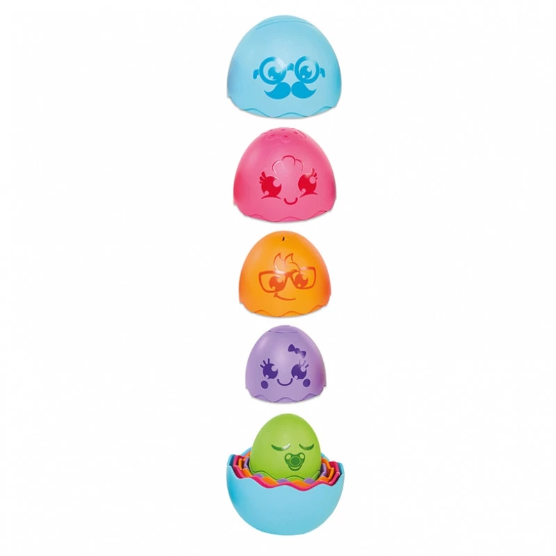 5 πολύχρωμα και φωτεινά αυγουλάκια μαζί με ένα κοτοπουλάκι στο κέντρο τους. Τα μικρότερα σε ηλικία παιδιά θα λατρέψουν το παιχνίδι της ένωσης των κελύφων και τον ήχο τους, ενώ τα μεγαλύτερα παιδιά θα ανακαλύψουν την ταξινόμηση των σχημάτων, των χρωμάτων και το παιχνίδι ρόλων.