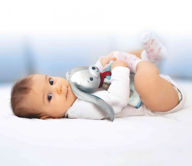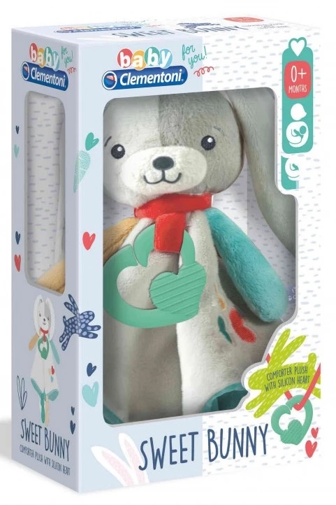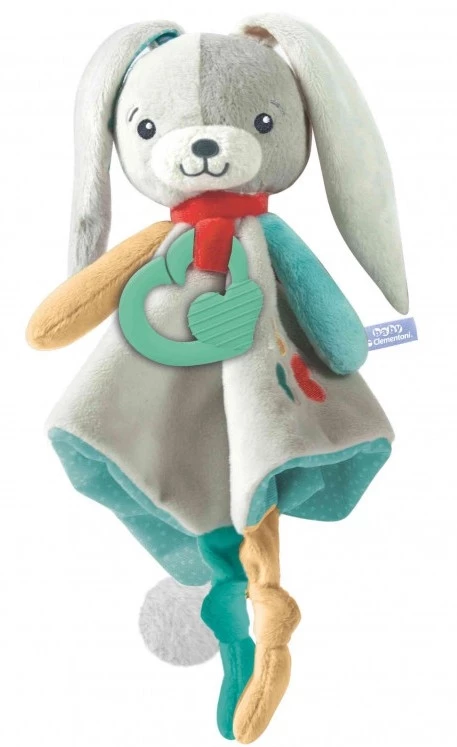 Baby Clementoni βρεφικό μαλακό χνουδωτό λαγουδάκι. Απαλό κουνελάκι-κουβερτούλα που καθησυχάζει το παιδί. Η καρδιά από σιλικόνη είναι μασητικό που μπορεί να την κρατά το παιδί, αλλά και να τη φορά η μαμά ως κρεμαστό κόσμημα. Το ύφασμα είναι υπο-αλλεργικό.