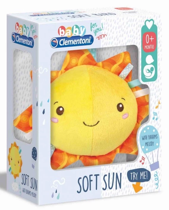 Baby Clementoni βρεφικό μουσικό χνουδωτό κρεμαστό ήλιος. Απαλός μουσικός ήλιος που χαλαρώνει το μωρό κατά τη διάρκεια του ύπνου. Με πλαστικό σύννεφο και κορδέλα για να το κρεμάσετε στην κούνια ή το καροτσάκι. Διαθέτει Μελωδίες του Μπράχαμς.