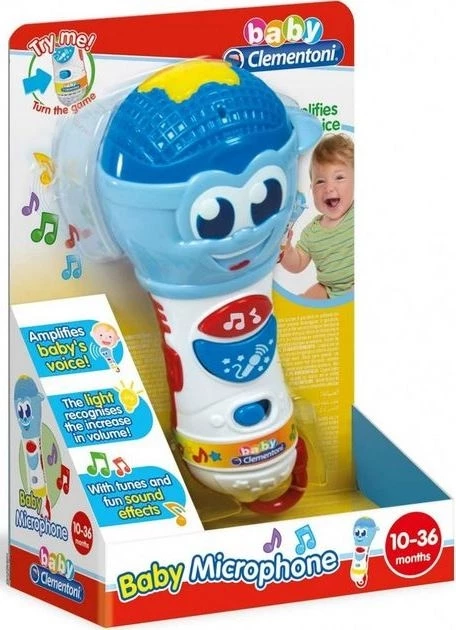 Baby Clementoni Βρεφικό Παιχνίδι Baby Microphone Χαριτωμένο μικρόφωνο με φωτεινά εφέ και πολύχρωμα κουμπιά που διεγείρουν την οπτική αντίληψη και το συντονισμό των κινήσεων. Ύψος μικροφώνου:16 εκ