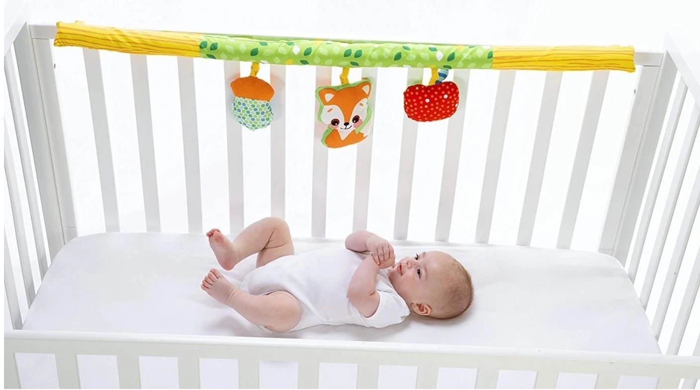 3 αφαιρούμενα κρεμαστά υφασμάτινα παιχνίδια, ένα εκ των οποίων με κουδουνίστρα, που γίνονται τα πρώτα παιχνίδια για το μωρό