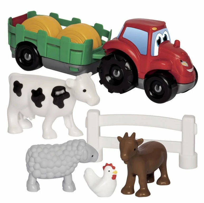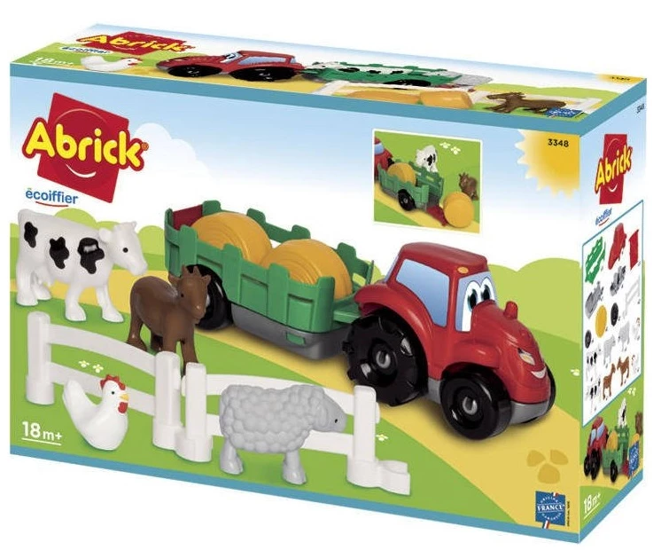 Ecoiffier Abrick Fast Car Tractor with trailer – Σετ αυτοκινήτου και αγροτικών ζώων. Περιλαμβάνονται: το τρακτέρ και το ρυμουλκούμενο του, μπάλες σανού, λευκός φράχτη, αγελάδα, πρόβατο και κότα. Συνολο τεμαχιων: 23