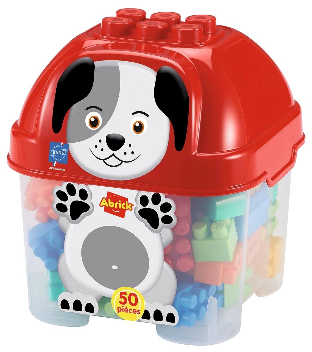 Σετ τουβλάκια 50 τεμάχιων σε πλαστικό διαφανές κουτί με κόκκινο καπάκι και με σχέδιο σκυλάκι.