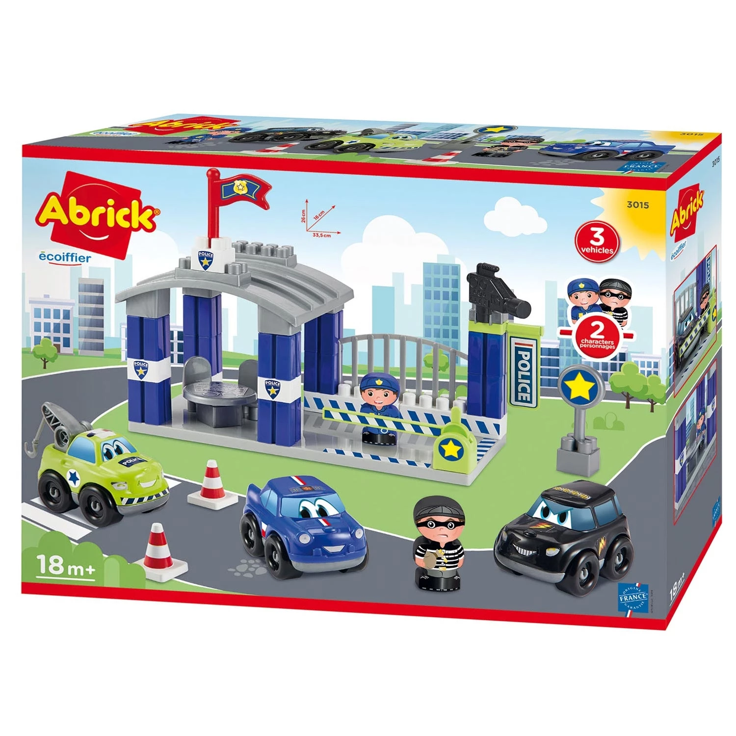 Ecoiffier Τουβλάκια Abrick Αστυνομικός Σταθμός Αστυνομικό τμήμα Abick. Περιλαμβάνει αστυνομικό, απατεώνα και τρία οχήματα.