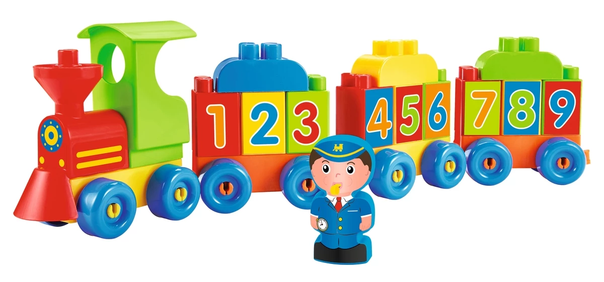 Τουβλάκια σε τρενάκι με σχέδιο γράμματα στα αγγλικά και αριθμού.