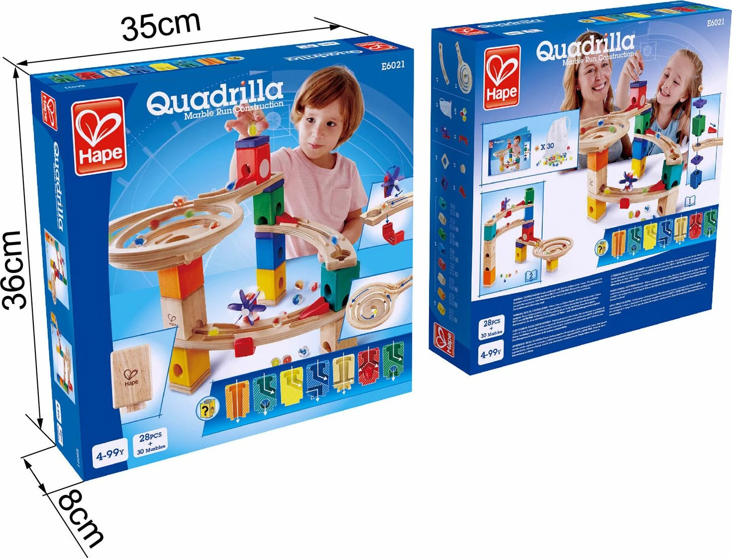 Hape Quadrilla Marble Run Ξύλινο Race To The Finish-58Τμχ Ξεκινήστε τις δικές σας πίστες με αυτό το σετ παιχνιδιού Quadrilla.Τοποθετήστε τις 2 μπίλιες στη κορυφή και παρατηρήστε να κατεβαίνουν από διαφορετικές διαδρομές. Διαστάσεις προϊόντος: 54x20x33cm (ΜxΠxΥ).