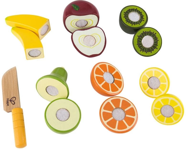 Hape ξύινα Fresh fruit Φρέσκα φρουτάκια .Σετ 7 τεμαχίων που περιλαμβάνει ένα παιδικό ασφαλές μαχαίρι για να κόβουν τα φρούτα με ευκολία.