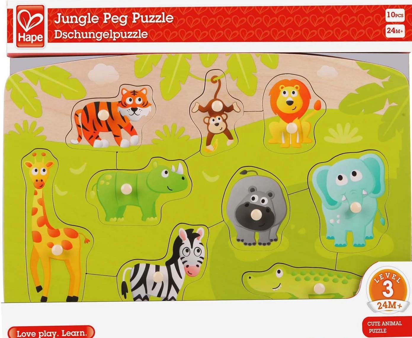 Hape ξύλινα Jungle peg puzzle παζλ με τα ζώα της ζούγκλας Διαστάσεις προϊόντος: 29,4×20,8×1,8εκ (ΜxΠxΥ).