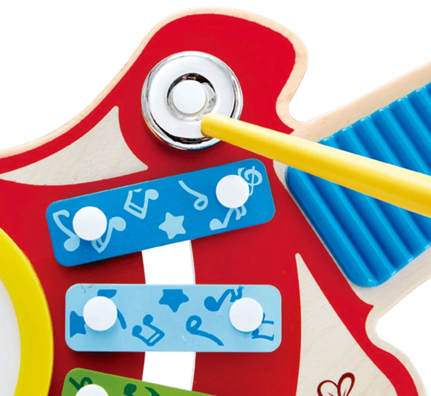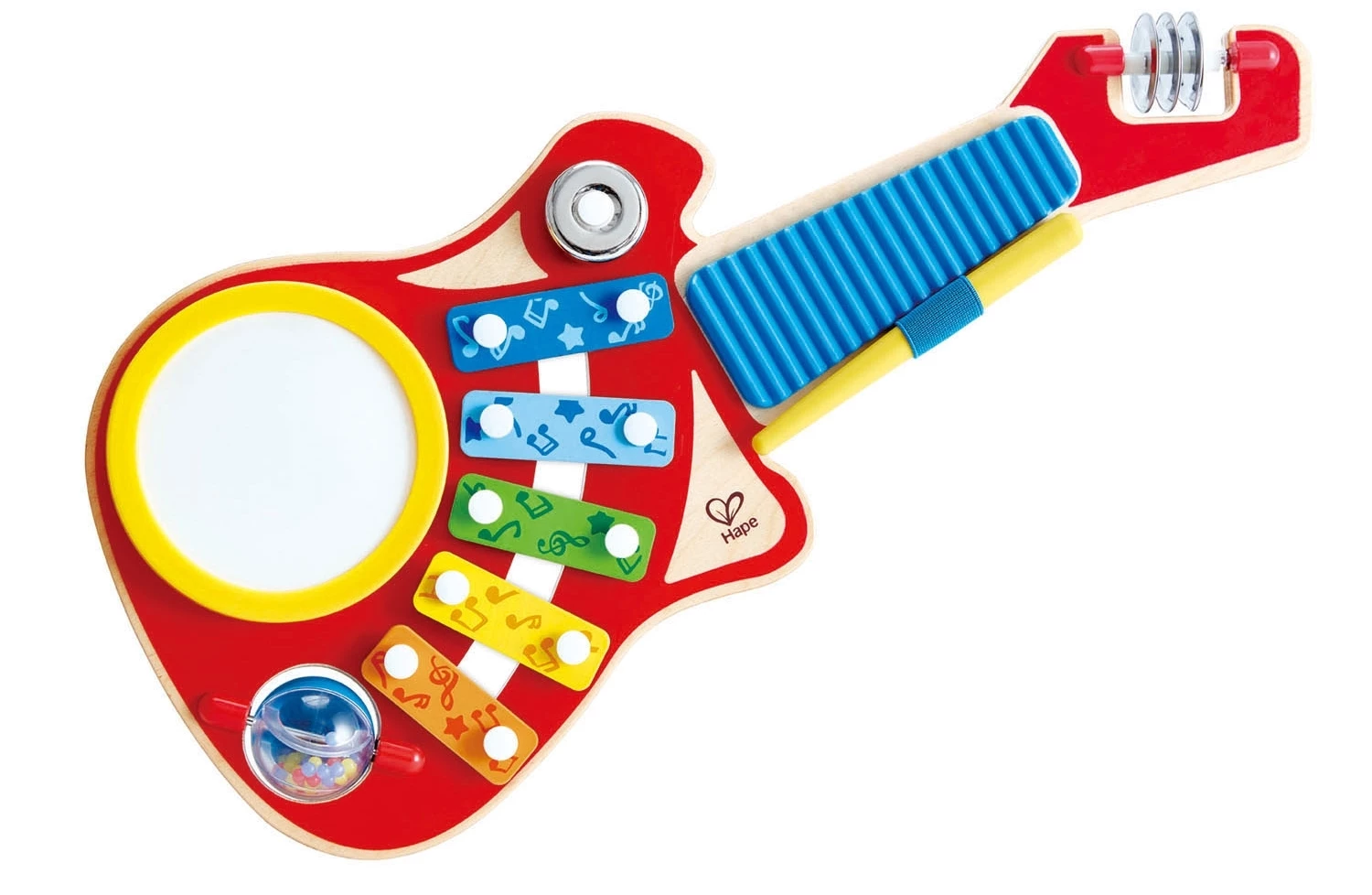 Hape ξύλινο μουσικό παιχνίδι – κιθάρα ορχήστρα δημιουργός ήχων Μια κιθάρα που δεν μοιάζει με καμία, αφού συγκεντρώνει πάνω της έξι διαφορετικούς ήχους: τύμπανο, καμπανάκι, μεταλλόφωνο, κουδουνίστρα, πιατίνια και έναν κροταλιστό ήχο. Το παιχνίδι ξεκινά και δε θα βαρεθείς ούτε στιγμή.