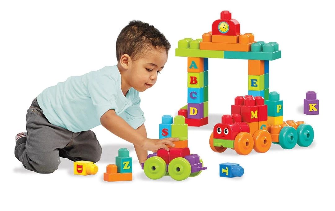 Επιβιβαστείτε στο τρενάκι με τα γράμματα! Το μωρό σας θα μάθει το αλφάβητο με ένα φιλικό τρενάκι που φτιάχνει μόνο του ενώνοντας τα ειδικά τουβλάκια που έχουν επάνω τους γράμματα! Συνδέστε τις τρεις βάσεις-βαγόνια και βάλτε επάνω τους τουβλάκια για να φτιάξετε λέξεις ή χρησιμοποιήστε τα τουβλάκια και τα σχήματα για να κατασκευάσετε έναν σιδηροδρομικό σταθμό!