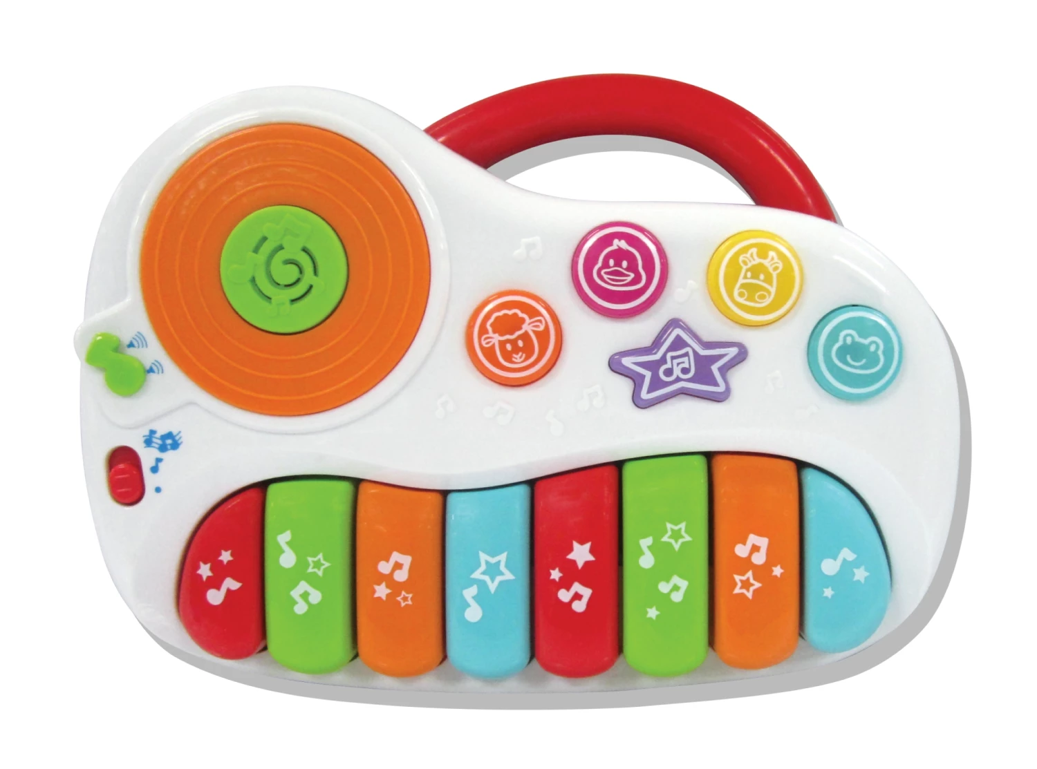 Πιανάκι με 8 χρωματιστά πλήκτρα-νότες που αναβοσβήνουν. Με DJ σκρατς που πατώντας το ακούγονται αστεία ηχητικά εφέ.Με 4 κουμπιά με ζωάκια και πραγματικούς ήχους ζώων.Με ενσωματωμένα τραγούδια. Με ρύθμιση έντασης ήχου και διακόπτη ON/ OFF.Με χειρολαβή για εύκολη μεταφορά.