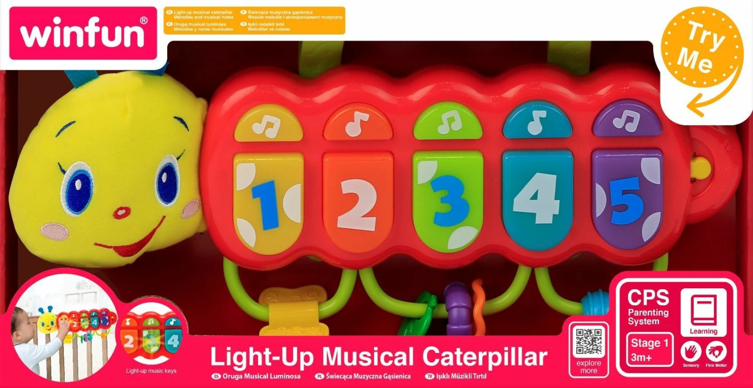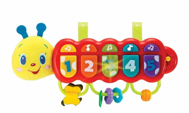 Παιδική κάμπια με φώτα, ήχους και μελωδίες. Με κεφάλι από μαλακό ύφασμα. Με χρωματιστούς και μασητικούς κρίκους. Προσαρμόζεται εύκολα στο κρεβατάκι ή στο καρότσι.
