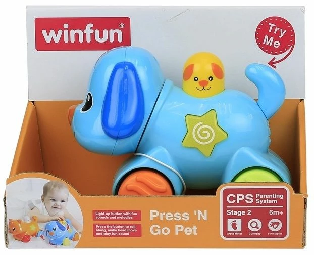 Το Χαρούμενο Ζωάκι Press N Go Σκυλάκι Με κουμπί που πατώντας το αρχίζουν να περπατά, να κουνά το κεφάλι και να τραγουδά. Διαστάσεις προϊόντος: Μήκος: 16 εκ. *Λειτουργεί με μπαταρίες, οι οποίες περιλαμβάνονται για δοκιμαστική χρήση.